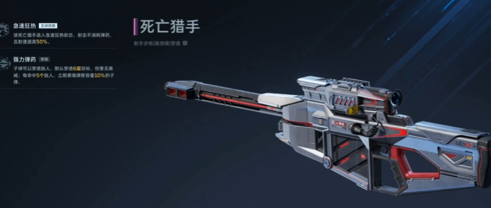 死亡猎手拥有着游戏中顶级的穿透能力,子弹射出后能够穿透最多6个敌人,并且对6个敌人的伤害都是一样的,极速狂热是它的主动技能,使用技能后射击不会消耗枪械的弹药,射速还会额外提升50%,在战斗接触到较多敌人的时候能发挥更强大的战略作用,单发子弹能一次性命中5个敌人后,还会获得额外的子弹伤害加成效果,战斗中能够越战越勇,使用增加暴击伤害的插件,能提升枪械的单发子弹伤害,使用增加换弹速度的插件,能提升战斗中换弹效率。
