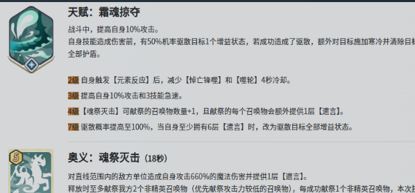 天赋霜魂掠夺是莫德雷德的压制核心,在战斗中会拥有10%的攻击加成,技能伤害还有50%的概率,会驱散目标一个增益状态。驱散成功之后就可以施加寒冷,并且清空护盾。在7级之后驱散效果就能提升到100%,凑齐6层遗言就能有效驱散目标全部增益效果。面对依赖多层Buff战场的敌人,会拥有着较好的优势。另外,触发元素反应之后能减少核心技能冷却的时间,让角色在元素队中就可以如鱼得水。在养成方面,好感度满级就可以解锁专属的剧情动画,成为了不少收藏党必练的角色。