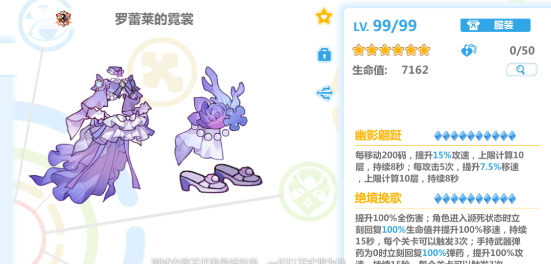 提升100%全伤害;角色进入濒死状态时立刻回复50%(100%)生命值并提升100%移速,持续15s,每个关卡可以触发3次;