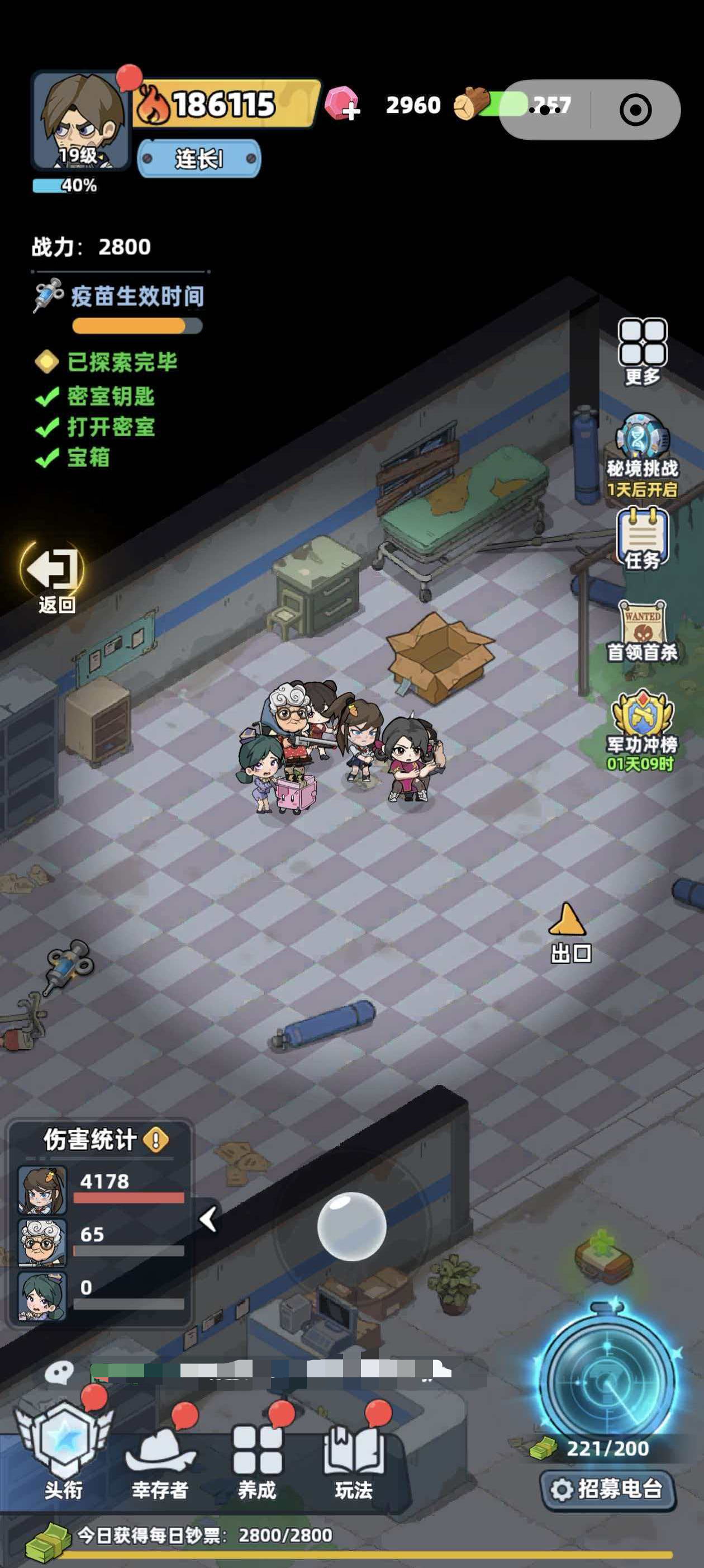 接下来就是看当前室内会有几个宝箱,室内的宝箱数量都会明确的给瓦玩家标出来,大家只要一间一间物资的去尽心探索就可以了,医院这里就是进入以后,先注册疫苗,然后会有僵尸出现,把僵尸给打败以后,玩家会获得钥匙,然后进入到左侧的房间内,会看到有一个宝箱,打开宝箱以后会获得技能书的抽卡券,之后推出房间,在向右侧的房间移动,房间内会出现僵尸,玩家在把僵尸击败以后,又会拿到开宝箱的钥匙,接下来就是用钥匙开宝箱了,等这个宝箱拿完以后,玩家就需要回答中间的走廊位置,在一直往前走,往前走时会在地上看到掉落的钥匙,捡起来以后,一直走就会在最里面的房间内看到宝箱,用捡到的钥匙把宝箱给打开就可以了。