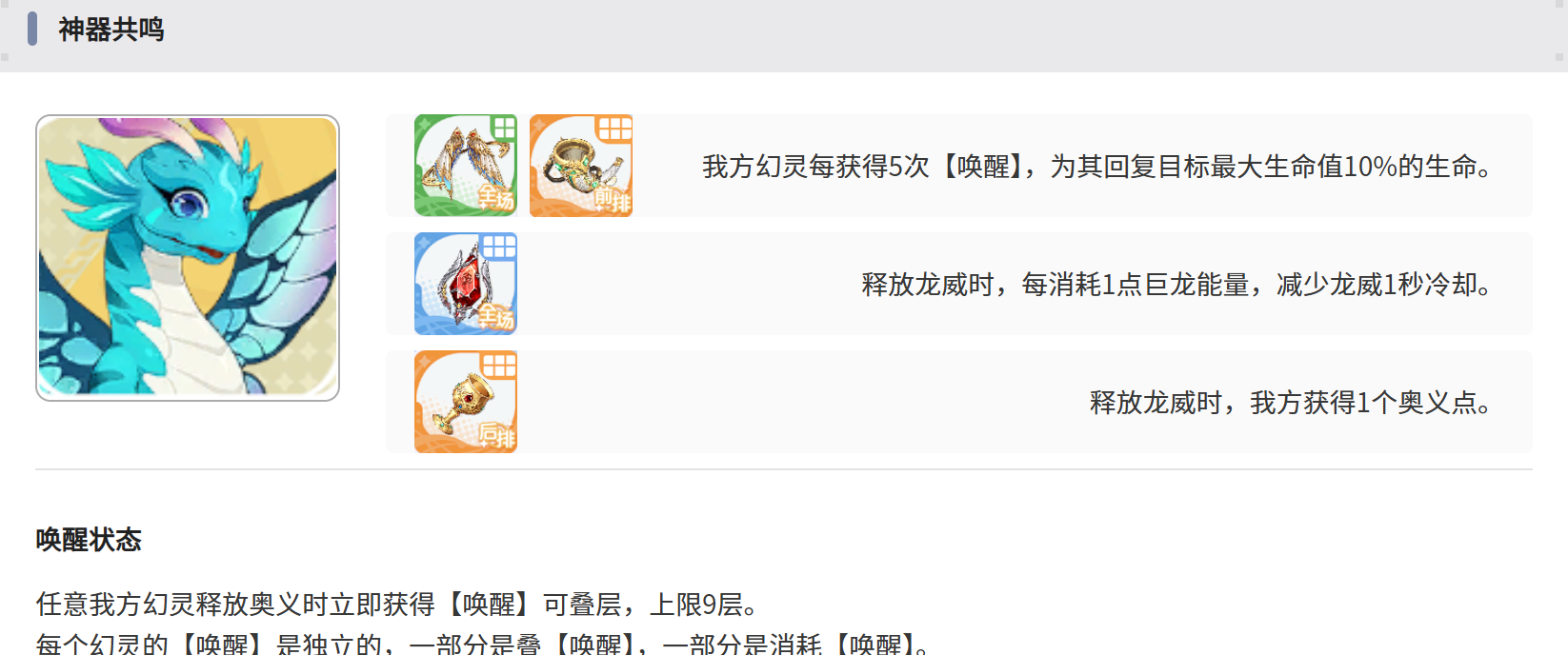 唤醒队的总体思路是以奥义能量和神器共鸣为基础,多名角色连续使用奥义之后就会快速累积起团队增益,从而打出爆发伤害。阵容主要以奥术和蓝龙为主,在实战中只要节奏不断,敌方就很难组织起有效的反击,因此该阵容体系在推图和公会战以及部分竞技环境中都能起到稳定的作用。