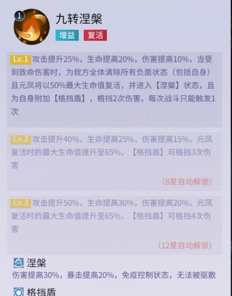 二技能在战斗开始时给我方全体添加一层凤羽效果,并对敌方全体造成一次伤害,当伤害可无视护盾,且给元凤对位的目标附加焚心,降低其受到的治疗效果,增加受到的伤害,风羽这个效果可以提升最终伤害,加强我方全体输出。被动技能除了提高攻击、生命和伤害之外,当元凤受到一次致命伤害时,为我方全体清除负面状态,同时自身还能复活,这样相当于多了一条命性,容错率非常高。