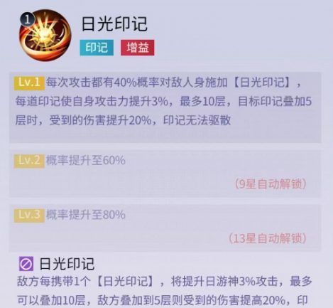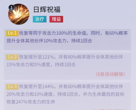 第二个技能属于自身的普攻,可随机伤害三个目标,比较中庸的技能。被动也是提升攻击力、生命值和治疗效果。大招在每次攻击时,都有几率给敌人身上施加日光印记,每到印记可以增加自身3%攻击力,最多叠加10层。目标身上的印记叠加5层时,受到的伤害提升20%。这个技能效果提升自身攻击力也就增加了治疗的能力,提高对方受到的伤害,也就辅助我方更好的输出,所以这个治疗在战斗方面还是比较全面的。