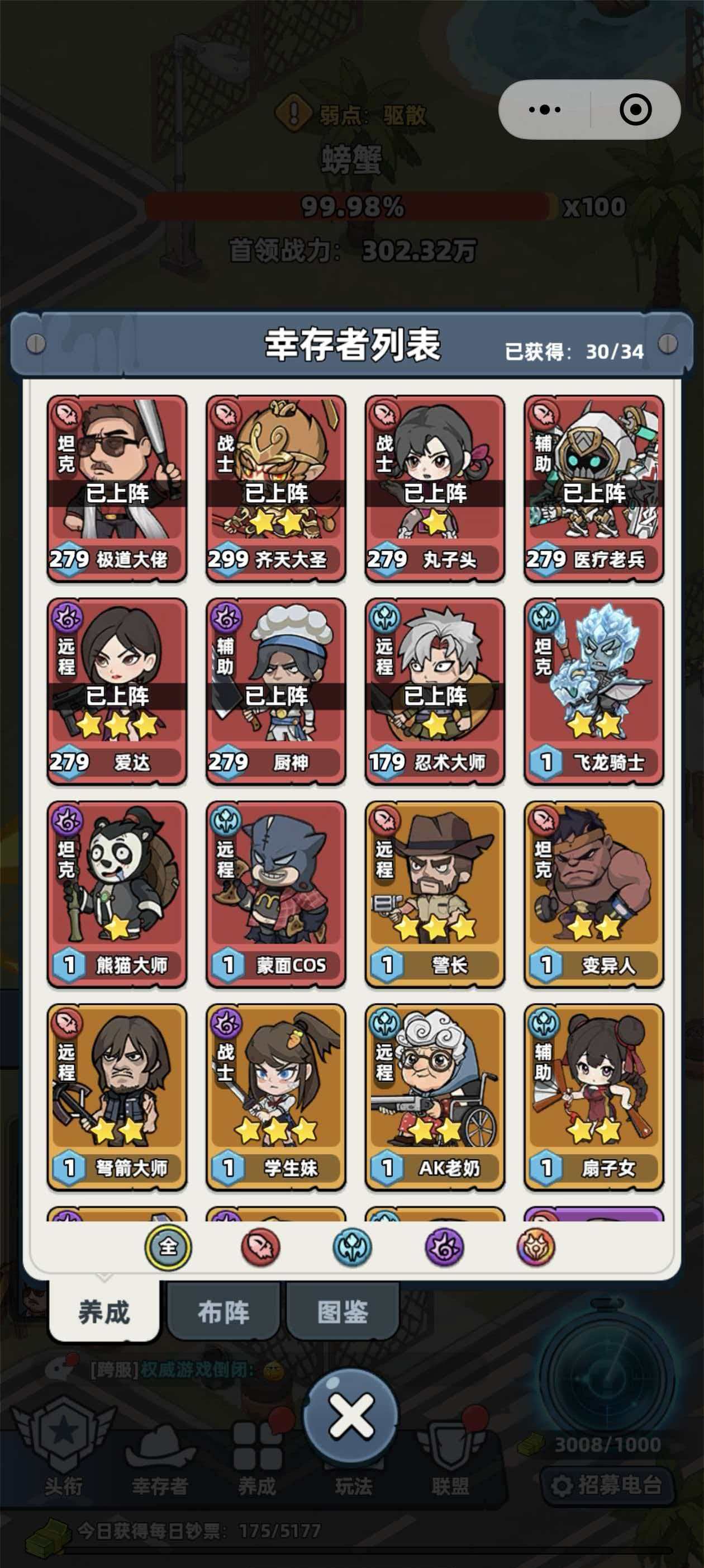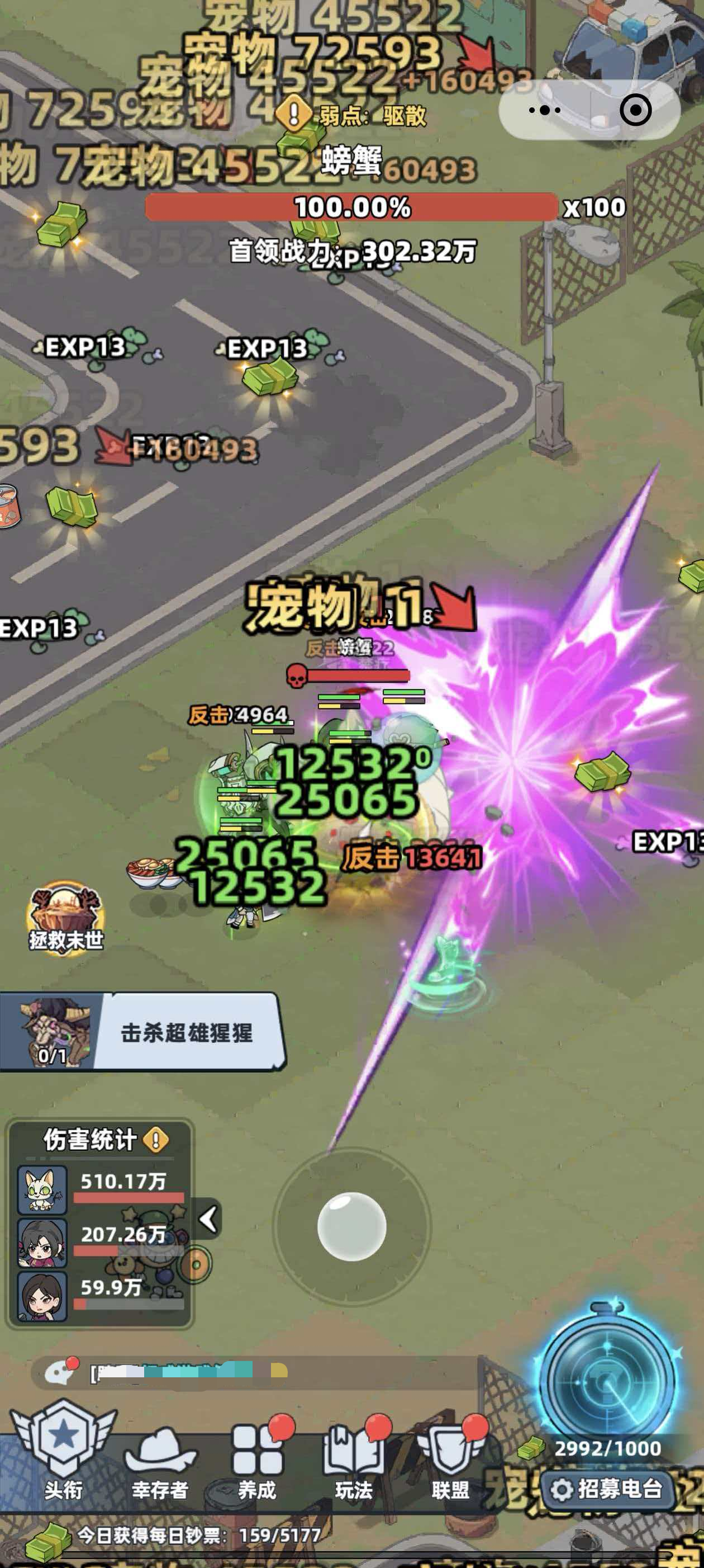 第二个就是打螃蟹的时候,玩家还需要螃蟹的弱点是什么,玩家第一次打螃蟹时会看到屏幕中boss血条的上面会有弱点,有的是需要带有净化能力的角色,有的则需要携带指定技能书,玩家则需要根基螃蟹的弱点来携带指定的技能书或者是角色哦,最后一点就是玩家在阵容上的搭配了,因为螃蟹自己回血的原因,大家在阵容上最好使用带有着高倍率伤害的幸存者,比如说齐天大圣以及爱达等等,这样就能够更快速的增加伤害,当然了能够回血的奶妈也是一定要带的,建议携带有能够吸血的奶妈,有了奶妈能够确保大家战斗时的续航能力。