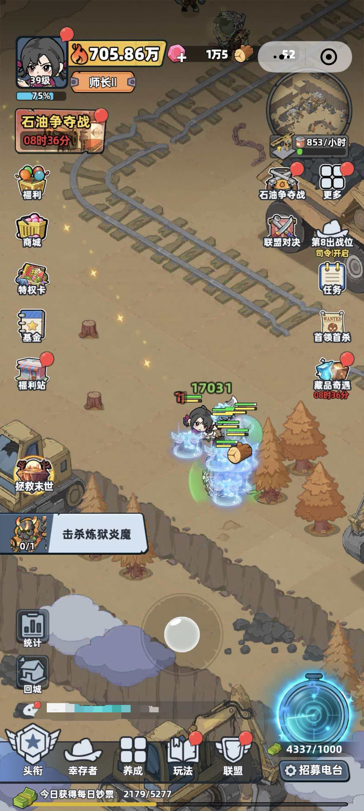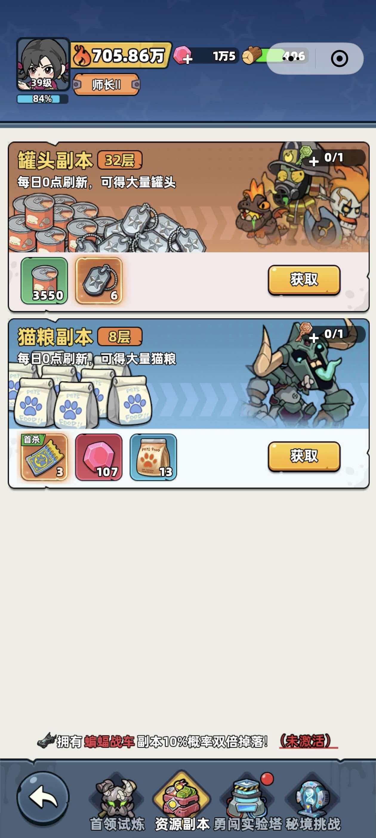 游戏中除了木材是需要大家获取的基础物资以外,还有着不少的基础物资需要大家获取,首先就是用来升级的罐头了,罐头可以通过副本、挂机工厂以及打怪等方式获得,除了罐头以外,钞票也是极为重要的物资,有了钞票玩家才能去招募幸存者,当玩家把系统中的幸存者给全都招募了以后,玩家就需要给幸存者升星了,升星需要的幸存者碎片也是要通过招募获得的,最后的资源就是猫粮了,猫粮能够提升宠物的等级,而象牙获取猫粮除了猫粮副本以外,还可以通过宠物招募以及探索房间等方式获得。