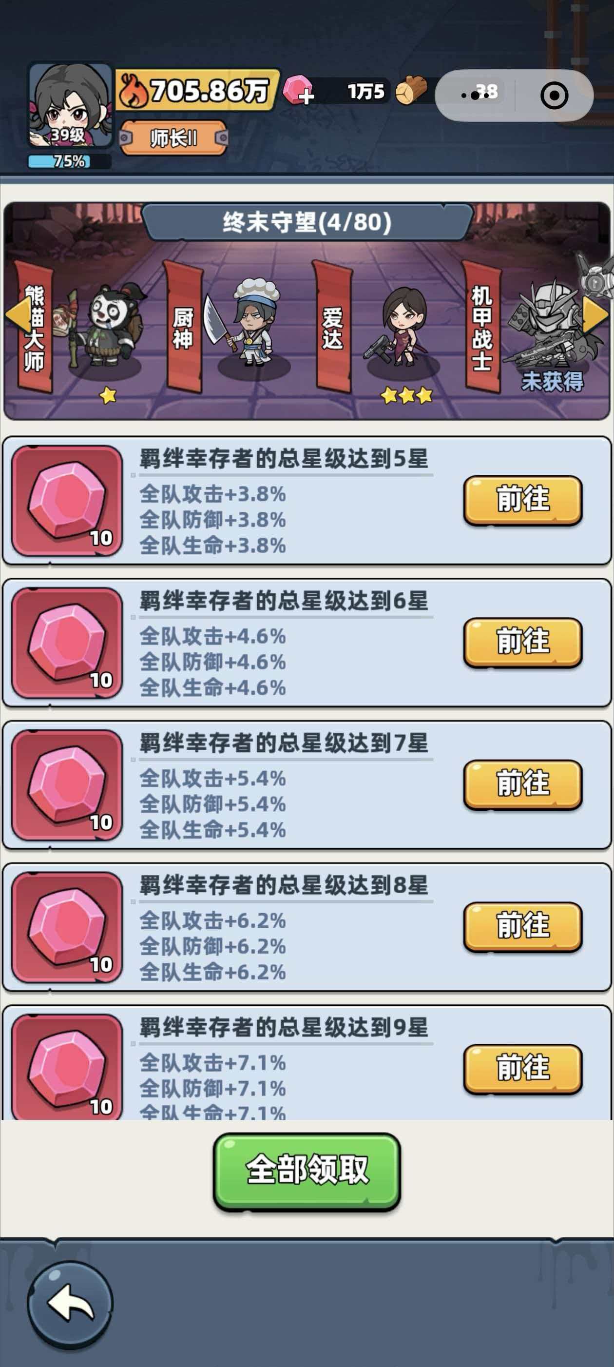 等到中后期以后,玩家基本上把角色都已经给抽到手了,神话品质的角色也已经有成功升星的了,那玩家这个时间在搭配阵容的时候就需要考虑到羁绊的效果了,那这里优先推荐比较容桂获取的雄猫大师+厨神+爱达+机甲战士+孙悟空,这一套阵容完全足够大家在中期使用,到了后期以后,阵容的搭配其实变化真的不大,只不过玩家有些神话+的角色建议玩家优先获取。
