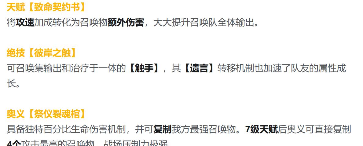 深入拆解圣女的技能,可以发现人海战术和属性成长的结合。丝碧莫的天赋能将攻速转化为召唤物伤害,解决了召唤队后期乏力的痛点。其绝技召唤的触手可以同时输出和治疗,独特的遗言转移机制可以把阵亡的损失转化为队友的属性加成,形成越战越强的闭环。最核心的奥义就是七级天赋之后可以瞬间复制四个强力召唤物。