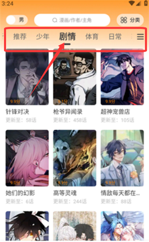 3、通过分类栏可选择推荐、少年或剧情等标签筛选内容。