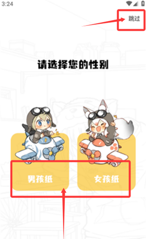 1、启动应用后,可在性别选择页面挑选偏好选项或直接跳过。