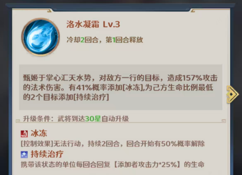目前使用甄姬的话,她还有另外的一个称号叫做洛水佳人,放在辅助位置上面使用的话,甄姬所要使用的技能叫做洛水凝霜,这个技能目前使用的话,只能针对敌人一行的目标来进行输出,此时造成的攻击数值是只有157%的,这个百分比是比较基础的法术伤害,但是在其中会有41%的概率可以成功的施加冰冻的效果,冰冻效果此时施加成功的话会有一定的控制,让敌人在此期间无法行动,并且在回合一开始的时候,这个冰冻效果其实是有50%的概率可以解除掉的,所以大家要注意后期快速的叠加起来,那么此时洛水凝霜达成冰冻的影响之后,还可以给我方生命数值比例最低的队友带来足够的持续治疗,此时可以成功的给两个队友都带来足够的持续治疗效果,一般是携带了这个状态的队友,每一个回合当中都可以恢复甄姬身上攻击数值提取的25%生命数值恢复,所以在甄姬攻击数值越高的情况下,给其他两个队友带来的血量恢复自然也会更高。