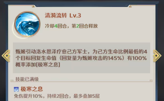 而另外甄姬在最多的冷却技能时间上面使用的是清漪流转这个技能,这个技能一般情况下是可以根据目前的治疗效果来给我方生命数值最低的四个目标带来回复的,而且此时选中了四个队友的话,一般情况下带来的恢复是根据甄姬身上攻击数值提取的145%数值进行恢复,也有100%的概率可以给其中的队友带来极寒之息,这个状态如果施加给队友身上的话,可以为他们带来的就是免伤的效果,提升10%的免伤之后还可以有5层的效果进行叠加,所以在此她可以给我方带来这类效果的话,就等于变相的为我方带来足够的生存提升,另外她在这个群体恢复的能力上面带来的百分比确实也是非常高的,所以算作是一个群体疗愈的能力。