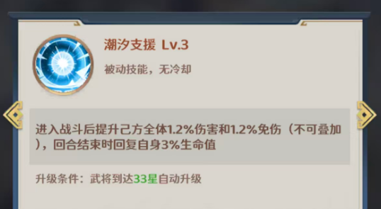 而另外它甄姬的被动效果上面使用的潮汐支援这个能力其实是没有什么限制的,一个回合里面也可以多次使用,在这里就算进入战斗之后,那么在触发的强度上面都是可以根据基础的1.2%全体伤害来进行增伤,另外除了增伤之外,她还有免伤的效果,同样也是1.2%的数值,此时这两个效果都是不可以叠加的,所以在甄姬自身数值本身就比较高的时候,来达成这个被动才是更好用的,另外这个被动在回合结束的时候还有一定的概率可以给她自己带来3%的生命恢复,所以在珍惜自己的生存能力上面,大家也不用担心甄姬有更多的被动可以触发给自身带来血量补足的能力。