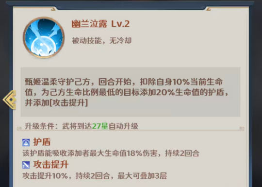 最后一个技能甄姬使用的话,带来的幽兰泣露被动效果上面也是可以根据一回合开始的能力来扣除当前的生命数值,每次扣除10%的生命数值之后,可以给我方生命数值最低的一个角色带来20%生命的护盾保护,那么此时使用这个技能的时候,大家首要就是确保甄姬自身的血量数值能够扣除掉10%之后,自身的安全性有一定的保障,而且此时如果生命数值最低的一个角色是我方核心的输出的话,那么使用这个技能得到的性价比是最高的,而且给这个角色增添了护盾之后还可以带来足够的攻击提升,一般情况下在我方需要达到最后一击时,利用这个技能是可以力挽狂澜的,而且技能当中带来的这个护盾也可以吸收目前甄姬最大生命数值上面18%的伤害,另外攻击提升的百分比也有10%,所以最大的时候提升到三层带来的30%伤害提升,可以作为收割的能力来进行使用。