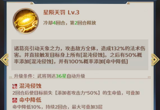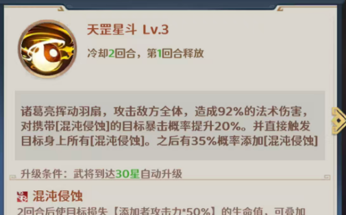 另外的星陨天罚这个技能是冷却达到4回合才可以再一次使用的,使用时诸葛亮依旧会攻击敌方全体,造成132%的法术伤害,此时还可以直接触发目标身上所有混沌侵蚀,之后有50%概率添加更多层的混沌侵蚀,并在此时有100%概率添加命中降低的能力,命中降低的这个状态会让敌人在命中数值上面降低10%,然后最大可叠加3层,而且每当敌方触发混沌侵蚀的时候,都可以立即为最低血量队友恢复11%攻击的生命值,这个机制一般在被对面盯的比较紧,且此时也处于高压环境下的话,也是相当好用的,15%的概率可以附加的混沌庇护让诸葛亮在上面有6%的三抗加成,所以就算是在在八回合的战斗中,他的被动触发几率也会更大一些。