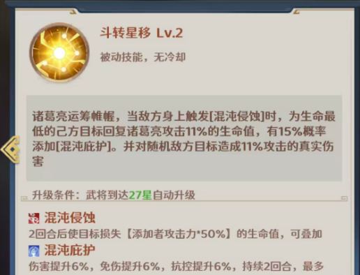 混沌强攻这个技能是进入战斗后提升诸葛亮自身9%的伤害,而在回合结束的时候,还可以回复自身4.5%生命值或对随机敌方造成真实伤害,这里的真实伤害数值是攻击方生命值的4.5%,这个技能升级条件是在武将到达33星的时候会自动升级的,所以也是从根本上就解决了法师的续航问题,另外是进入战斗的时候诸葛亮就有机会可以获得9%的增伤,这个数值虽然看起来不高,但是回合结束的时候也是有更多的灵活性可以选择,如果是诸葛亮自己血量健康的话,这里可以选择对随机敌人造成生命值4.5%的真实伤害,如果是对坦克类型的敌人用还是很好的,另外如果是在残血状态当中的话,这里4.5%的回血又能保证诸葛亮的生存效果不受影响,所以诸葛亮其实是不算占用治疗位的,如果是他带队的话容错率也会更高。