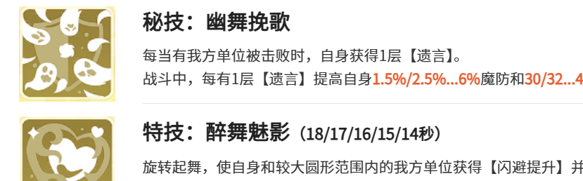 幻舞迷踪就是角色的天赋,这是立足战场的根基,在战斗的过程中,最高可获得1440点闪避加成,让他很难被击中,每一次都可以成功的闪避,可以获得7.8%的最大生命值回复,还可以给敌人附加醉步迷香的状态。更厉害的是,我方单位在施加感电时,还能获得5.2%的增伤以及减伤的叠加,最多可以叠加10层。当天赋提升到7级时,满城醉步迷香触发的中等范围5秒魅惑,搭配30%最大生命值回复,总是可以在危局中逆转乾坤,只是每一个目标在15秒内只能触发一次。