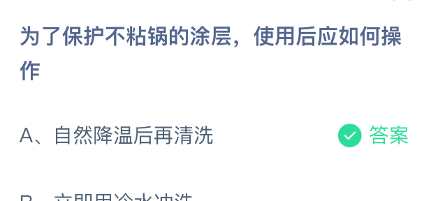 为了保护不粘锅的涂层,使用后应如何操作?支付宝小鸡课堂开课啦!每天花一分钟答题赚饲料,喂喂小鸡就能贡献爱心啦!轻松又意义十足!2026年1月27日蚂蚁庄园的小鸡课堂题目正确答案是【自然降温后再清洗】,为了保护不粘锅的涂层,使用后应自然降温后再清洗。