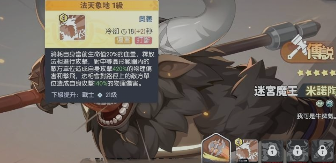 迷宫魔王是典型的均衡型坦克向幻灵。其基础生命值与物理防御成长在全战士职业中位居前列,配合技能“法天象地”——消耗当前生命值触发大范围物理伤害,实现“以血换伤”的战术循环。该机制既保障了前排站桩能力,又赋予其可观的AOE清场效率,适合需要持续压制多目标或应对小怪群压力的关卡场景。