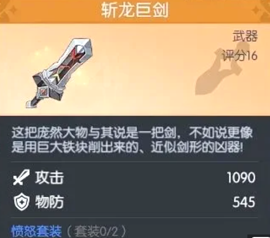 重型近战武器代表,主打攻防一体与资源续航。“斩龙巨剑”提供1090点攻击力与545点物理防御,同时附加20%攻击速度与25%怒气回复效率加成。该特性使其成为怒气驱动型角色(如战士、部分坦克)的首选主手武器,可加速怒气积攒,保障核心技能稳定释放频率。