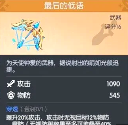 作为远程物理输出的标杆级弓类武器,“最后的低语”以1090点基础攻击力与545点物理防御加成构筑扎实面板。其核心机制在于:激活后提升自身20%总攻击力,并使每次普攻与技能攻击无视目标12%物理及魔法防御,配合高穿透特性,在应对高双防Boss时优势尤为明显。综合评分达16分,稳居当前弓系武器梯队顶端。