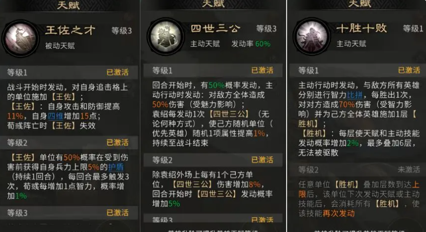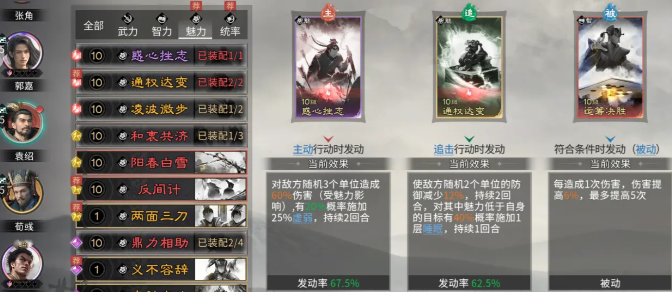 技能搭配上,袁绍推荐携带惑心挫志、通权达变、运筹决胜。其中“运筹决胜”可显著提升其天赋“四世三公”的触发次数,并附加虚弱、睡眠等控制效果;首次受击时还可获得额外兵力增长,强化生存与反打能力。荀彧技能组推荐鼎力相助、通权达变、缮甲厉兵,三者协同可增强燃烧伤害、降低敌方防御,并为友军提供高额减伤——受击时实际承伤降低80%。郭嘉则选择兵无常势与运筹决胜,专注群攻与残血斩杀,每层攻击提升6%,叠满5层后可基于天赋多次发动追加输出。
