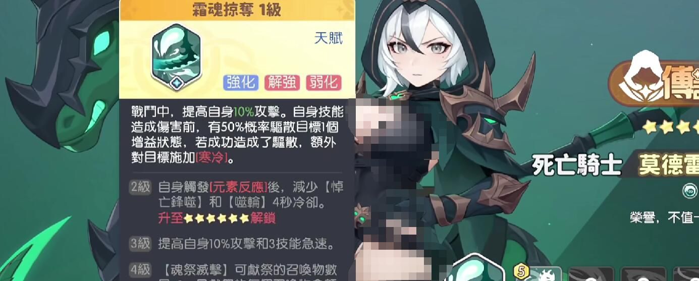 核心机制围绕“增益清除”展开:死亡骑士所有主动技能均具备稳定驱散效果,可精准移除敌方单位已激活的各类增益状态(包括但不限于攻击力提升、减伤护盾、回能加速、行动条加速等)。这一特性不仅直接削弱敌方战力,更间接强化己方输出环境——当敌方失去关键增益支撑后,其生存能力与持续输出效率将大幅下降,为我方后排创造安全且高效的输出窗口。