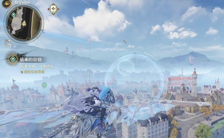 第三阶段为纯空中巡航:角色脱离气流后进入自由飞行状态,路径全程由连续分布的加速光环构成。玩家需操控飞马逐一穿越每个光圈,借此维持最高速度推进。该阶段无复杂操作干扰,节奏稳定,最终目标为抵达终点灯塔并与守塔NPC交互,确认任务完成。