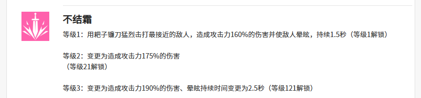 另外克拉拉在技能二效果上面可以带来不结霜的能力,此时是可以带来攻击能力的招式,利用这个不结霜,克拉拉可以利用自己的镰刀作为武器,快速的攻击目前离她最近的一个敌人,接近这个敌人进行输出的时候,造成的攻击能力会有160%的伤害数值,其中带有的控制是眩晕的能力,持续时间只有1.5秒的时候,大家就要注意后期快速的其他的技能使用才会更好,最强的时候是不结霜的技能强度达到等级3,那么此时眩晕的时间会更长一些,可以达到2.5秒。