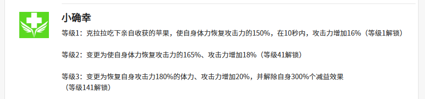 而小确幸这个技能其实针对克拉拉来说就是给自己带来足够的治疗恢复,这里她通过小学新技能会产生一个苹果,通过食用这个苹果,克拉拉可以给自身带来足够的攻击,体力恢复基本是根据克拉拉的攻击数值提取150%的数值来进行恢复。而且此时克拉拉不仅可以让自己的生存血量变得更多,还可以在后续的10秒时间之内通过16%的攻击加成来快速给敌人带来更多的伤害能力,达到等级3的时候,此时还可以解除自身的减益效果,这里解除的简易效果上面达到的百分比也有300%的数值。