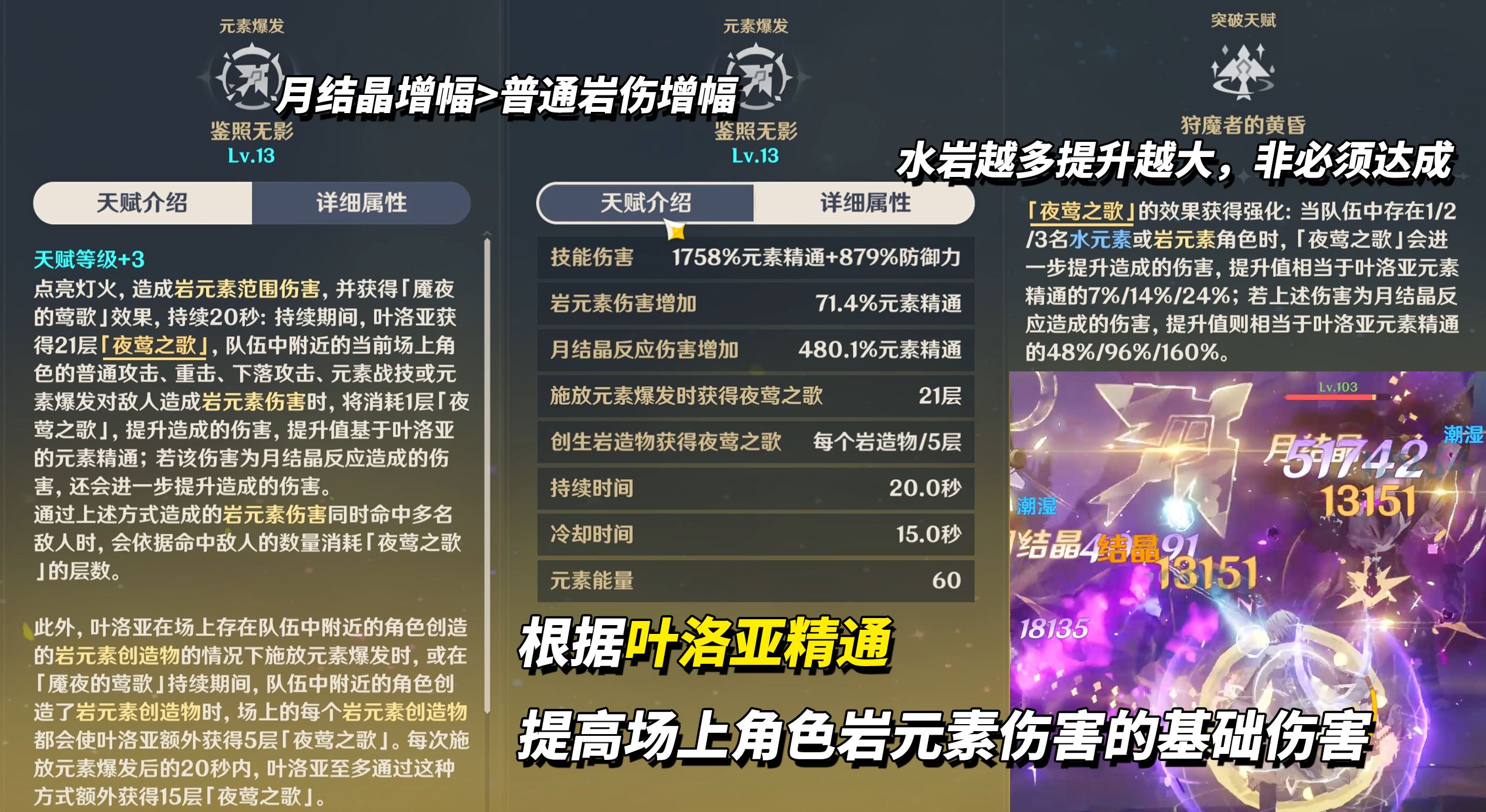 ③当队伍存在1/2/3名水或岩角色时,「夜莺之歌」额外基于叶洛亚元素精通提升基础伤害,岩元素伤害7%/14%/24%精通,月结晶伤害48%/96%/160%精通。