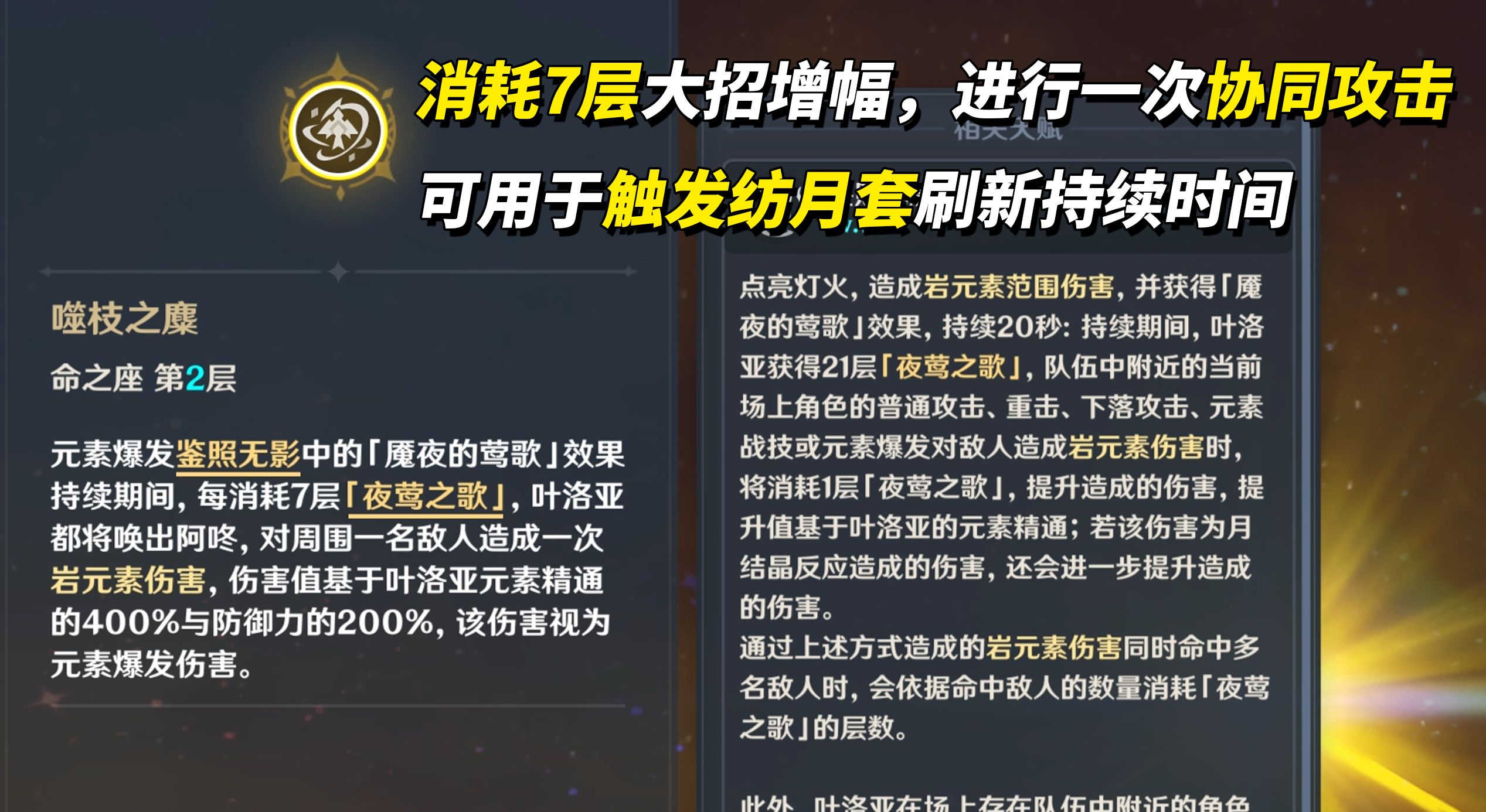 2命,元素爆发期间每消耗7层「夜莺之歌」,叶洛亚会造成一些400%精通200%防御的单体伤害。叶洛亚唯一后台脱手出伤机制,可触发纺月套延续BUFF。