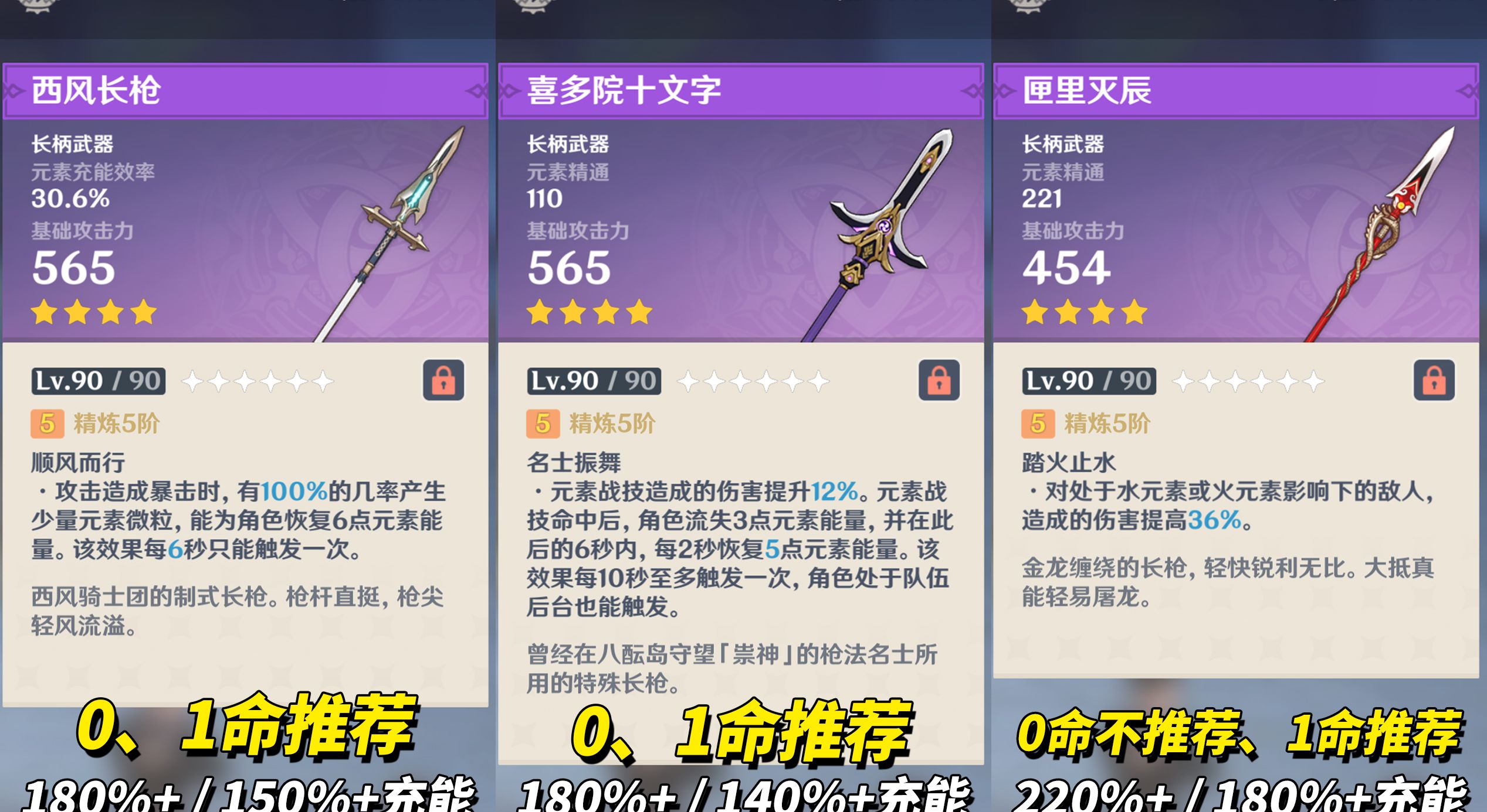 【0命叶洛亚】推荐前2把武器,充能压力相对小许多。西风长枪考虑带个暴击头触发武器效果,喜多院十文字则需6秒回能叶洛亚得先战技起手。