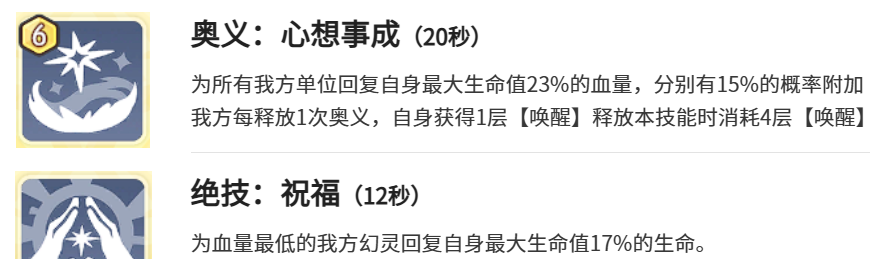 奥义技能和天赋是相同的名字,具有20秒的冷却时间,可以给我方单位回复最大生命值将近23%的血量。我方在每一次释放奥义时,祈愿灯神就会获得一次唤醒,一旦在积累4次唤醒之后,就可以释放奥义。可以让这一次的技能必定触发天赋效果,一瞬间就能够实现群体高额治疗以及双重增益,成为扭转战局的关键。12秒冷却的绝技,就会具备精准聚焦的效果,专门为血量最低的队友送去大概17%的最大生命值回复。