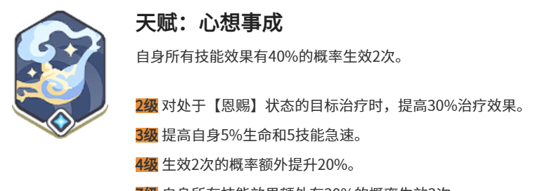 心想事成天赋就会藏着一种不一样的力量,自身所有技能全部都会有40%的概率生效两次,到了后期,随着天赋等级逐渐的提升,这份概率就会额外的增加20%到了7级之后,更加可以解锁30%概率生效三次的超强效果。当队友处于恩赐状态时,治疗的效果就会明显的提升30%。自身5%的生命加成,还有5点技能急速,让他在战场上可以迅速的释放技能,还有稳固续航。这一份心想事成的天赋,并非是绝对万能,但总是在关键的时刻带来意外之喜。