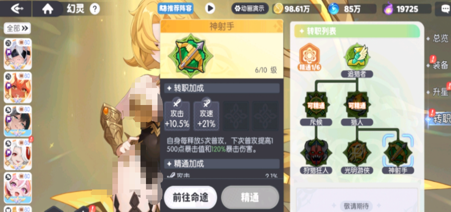 最后就是转职成狩猎狂人,这个属于斥候系的分支,转职成功后会获取物理防御以及攻击力的加成。机制特色则是每获取增益则增加一定程度的攻击力,并且需要叠层,最多只能叠10层,他在转职之后,无论是攻击力还是数值加成一类,他都比不上前两个职业,但是它的优势也非常明显,就是泛用性极强,适配度超高,在搭配多种增益阵容的时候。都有极强的适应性,而他本身攻击力不足的问题,则可以通过装备等词条来补充,在搭配方面的表现更为优异。