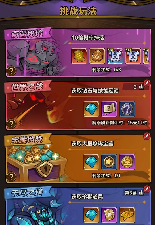 玩家每次闯关都能拿到装备、宝石、元素经验等资源,是玩家获取基础资源的核心渠道,但要注意每次闯关都需要消耗5点体力,没有体力时无法进行闯关。