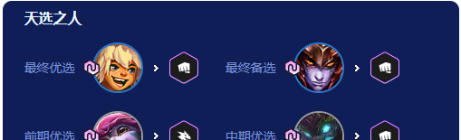 1、前期做羊刀过度强度最高,建议用龙魂小炮天选,搭配2格斗3龙魂2射手羁绊打工。连败局可以不拿天选,等5人口拿2-3费天选。