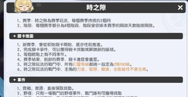 “时之隙”为赛季制独立玩法,每赛季持续两个月,共划分为8个阶段,随赛季开启天数逐步解锁。赛季开启后,所有玩家需从初始关卡重新推进主线,完成各类动态事件以获取奖励。事件类型包括宝箱资源点、野外怪物遭遇战等,内容丰富且具备随机性。需特别注意:赛季结束后,关卡进度将完全重置;同时,所有幻灵等级统一锁定为2100级,确保公平竞技与策略比拼的基础一致性。