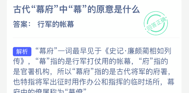 古代“幕府”中“幕”的原意是什么?【蚂蚁新村每日一题】2026年1月30日题目已发布!坚持答题,积累木兰币,即可加速小镇建设。答对本题,立即可享“产速+3/时”的加速奖励!今天正确答案是【行军的帐幕】。“幕府”一词最早见于《史记·廉颇蔺相如列传》,“幕”指的是行军打仗用的帐幕。