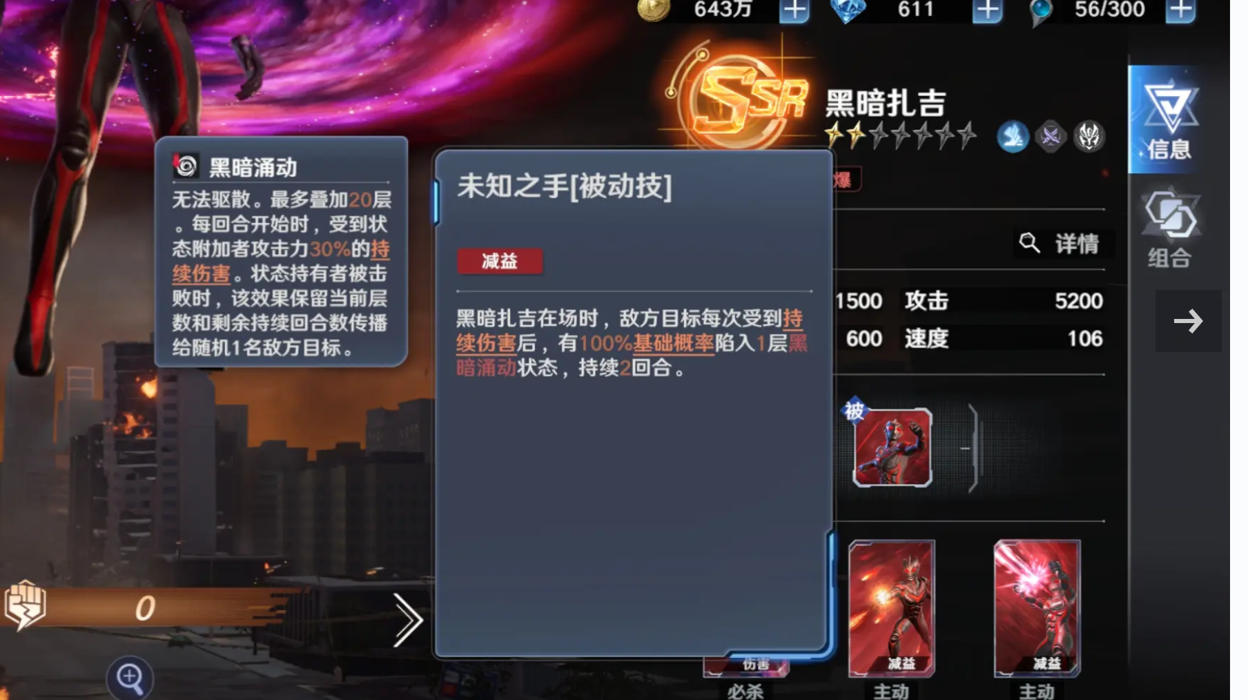 奥特曼光之战士黑暗扎古角色的强度还是很高的,主要依靠把持续百分比伤害和重力控制完美结合起来的深渊战斗体系。黑暗扎古的普攻暗能脉冲有很强的破盾能力,可以连续用能量波攻击目标并叠加名为黑暗涌动的持续减益状态。将叠层深度和输出上限深度绑定在一起的逻辑,使该角色面对高生命值的BOSS时具有很高的战术权重,在触发技能重力坍缩的时候,可以瞬间把大范围内所有的敌人牵引到核心地带,并且加快叠层的速度。