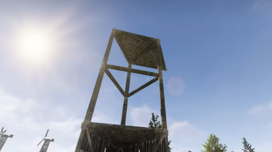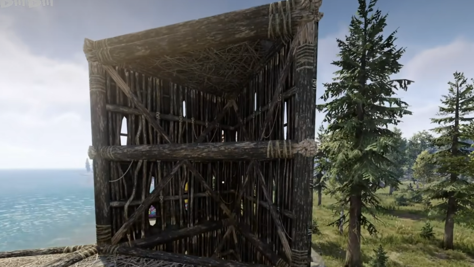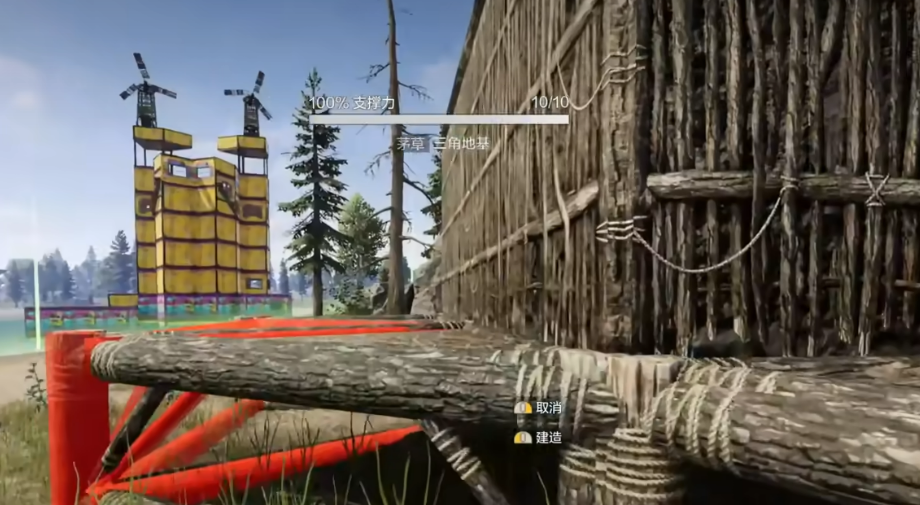 下一步是扩建炼油机房间和复活房。先把地基建好,然后把左边那块方形地基拆掉,因为炼油机只能放在地面上。装一个门框用来放售货机,再把周围围起来。记得在中间位置留个门。这边可以放床和衣柜,另一边就是炼油机和售货机的位置。回到二楼,可以扩建一个小炮眼,这个对前期守家帮助挺大的。把二层的墙围起来,再建上去的路,顺便把顶部盖好。到这里其实也可以停一停,要是这时候能搞到卷帘门,晚上睡觉就安全多了。
