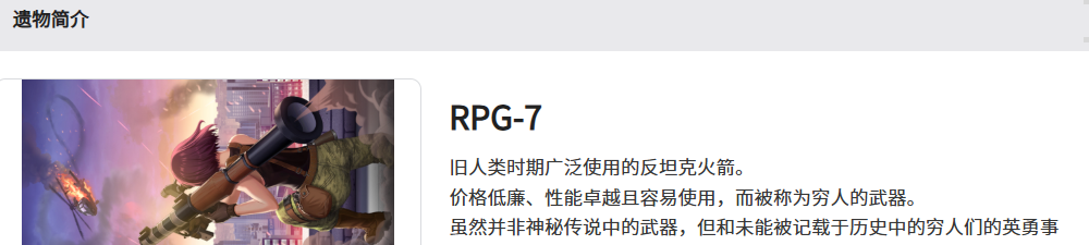 她的遗物是rpg-7,这个遗物的外观就是一个反坦克火箭,而且性能是非常不错的,利用这个遗物她可以触发的技能效果是弗林的魔法棒,利用技能她可以触发一个人更自在的效果,新增的暴击率也会增加8%的数值,而且改到周边2.5m之内范围只要没有其他敌人的时候就可以发动这个技能了,此时就算有队友在旁边,她也是可以一样进行触发的,然后发动的技能是火药味好好闻这个技能,此时用到一般攻击的话会对攻击的目标造成60%的额外伤害效果。