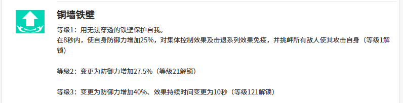 克洛伊的第二个技能叫做铜墙铁壁,使用这个技能的话,大概可以给她自身带来一定的保护效果,在每8秒时间之内,克罗伊就可以根据技能的效果为自身带来防御力上面25%的增加,而且对于气体控制当中的能力来说,她其实是可以对敌人释放的一些击退能力直接免疫的,所以在此时对面如果有此类角色的话,克罗伊根本就不用害怕,并且她可以挑衅所有的身上,让这类敌人的效果受到一部分的影响之后,就会快速的将攻击能力都释放到克洛伊的身上,所以放在前排算作是一个嘲讽拉伤害的效果。