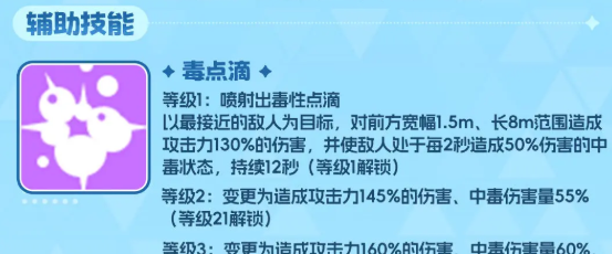 而瑞贝卡的辅助技能叫做毒点滴,使用起来的话带来的中毒效果也是非常明显,此时可以用瑞贝卡的这个技能来喷射出各种毒性点滴,攻击离他比较近的目标,对敌人进行输出的时候可以造成攻击力上面130%的伤害数值,受到他此类攻击的话,敌人会一直处于中毒状态当中同样也是每2秒就会造成50%的伤害,后续的10秒时间之内带出来的这个伤害一共是有6次的,而她的第二个辅助技能叫做合成肾上腺素,这个技能在游戏当中可以快速的刺激队友的效果,在10秒之内给目前攻击力效果上面最好用的队友带来生命、攻击数值增加20%的效果,而且她攻击力增加20%之后,暴击同样也是会有10%的提升,所以对于当前的手术类型角色来说,瑞贝卡带来的这类效果绝对是非常强势的。