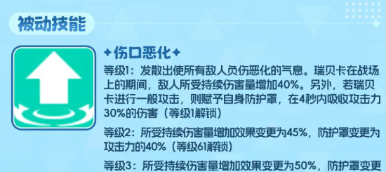 另外在被动技能上面瑞贝卡可以用的是伤口恶化,这个技能可以让她在使用效果时让所有敌人受到到目前负伤的恶化影响,瑞贝卡会在技能生效期间让敌人所有受到这些伤害的数值增加到40%,另外如果瑞贝卡在这里进行一次额外攻击的话,就会给她自身带来一层防护罩的防御,在4秒钟时间之内还可以吸取到对面攻击力上面30%的伤害,所以这个技能就是搭配她前面的挂毒技能是比较好的,毕竟挂毒的效果每1秒之内才会带有基础的伤害,那么在这里她的增加能力也可以让对面受到中毒效果的时候带来足够多的伤害加成。