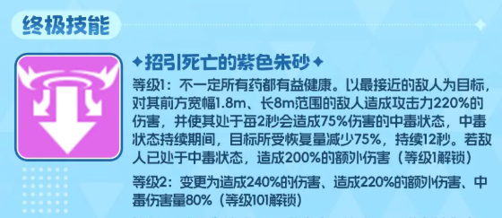 而瑞贝卡的终极大招效果上面是可以带来招引死亡的紫色朱砂技能,使用这个技能的时候再集中,瑞贝卡以目前最接近她位置的敌人为目标,当然了只要是在大前方长38米,然后宽幅达到1.8m的范围之内,所有的敌人都会受到她此类攻击,此时她造成攻击200%的数值之后,就会另外再加上一个更高的中毒能力,此时每2秒带来的基础伤害数值已经达到了75%,比前面的50%还要高一些,而此时在中毒状态生效的时间当中,所有目标受到对面奶妈回复的话,也会减少75%的恢复量,所以在敌人已经处于高度中毒状态的时候,我方带来的这种额外伤害,以及减疗效果也是可以快速的克制住对面奶妈的一些恢复能力的。