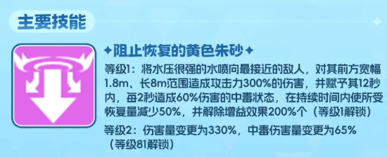 瑞贝卡的主动技能效果是阻止恢复的黄色朱砂,在使用的情况下可以将手中水压很强的一个水枪喷向最接近他的一名敌人,对前方的敌人来说,瑞贝卡可以造成的范围攻击当中带有的是300%的伤害,并且在此时还可以在技能生效的12秒之内,每2秒的时间当中就触发一次60%的伤害,这类效果就是根据中毒状态进行触发的,所以在持续中毒的期间之内,她所受到的回复量也会减少50%,此次给敌人增加这类减益之后,还会解除掉敌人身上的增益效果,不过在这里解除增益的百分比是只能达到200%的数值,相比较于其他的技能效果来说,她的这个技能用起来的话能力比较多,可能后期要搭配连招的话会有一定的复杂效果。