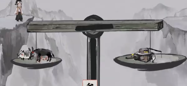 《栖云异梦:梦蝶》第五关“人烟”需在老伯处收集【铲】、【盆】等六件物品,在眺望台与平台分别获取【鸟】与【猪】。解开天平谜题:左盘放【鱼】和【铲】,右盘放【盆】。随后取走【铲】备用,并用【炊】拆出的【火】烧掉拦路木头。最后将【铲】与【肠】拆解组合为【钥】,为小女孩打开大门即可通关。