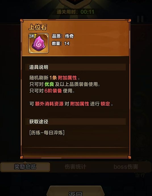 挑好要用的技能词条后,玩家也将正式开始战斗。本玩法的目标很简单,那就是将boss击败即可,但要注意挑战时限只有5分钟,所以对角色的练度有着较高的要求,最好将天赋、技能等都搭配到角色当前最强的状态后,再去尝试挑战本玩法。挑战成功后便能立刻拿到掉落的上位石和下位石,随即便可直接在装备洗练中使用,并且挑战所花时长不会对资源掉落的数量产生影响,只要在5分钟内完成就能领到全部的奖励。反之,若是挑战中被boss击败,亦或没能在时间内完成,则都视为视为,没有任何的奖励。