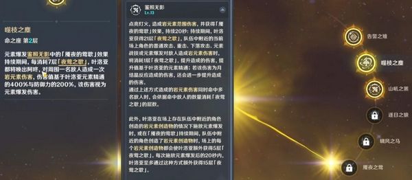 叶洛亚的核心机制聚焦于元素爆发「夜莺之歌」:施放后生成持续12秒的领域效果,为全队提供岩元素伤害加成与月结晶反应伤害提升。该增益可被队友各类攻击(普通攻击、重击、下落攻击、元素战技、元素爆发)消耗层数,每层消耗均触发额外岩伤,并依据角色自身元素精通数值按比例提升伤害倍率。